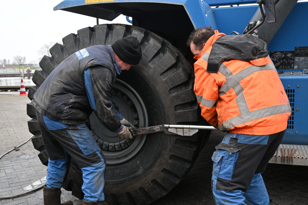 Op locatie hebben wij de banden van een zware terminalmachine vervangen. Dit soort machines draaien lange dagen en dragen continu zware lasten. Dat vraagt niet alleen om sterke, slijtvaste banden, maar ook om vakkundige montage en de juiste apparatuur.
