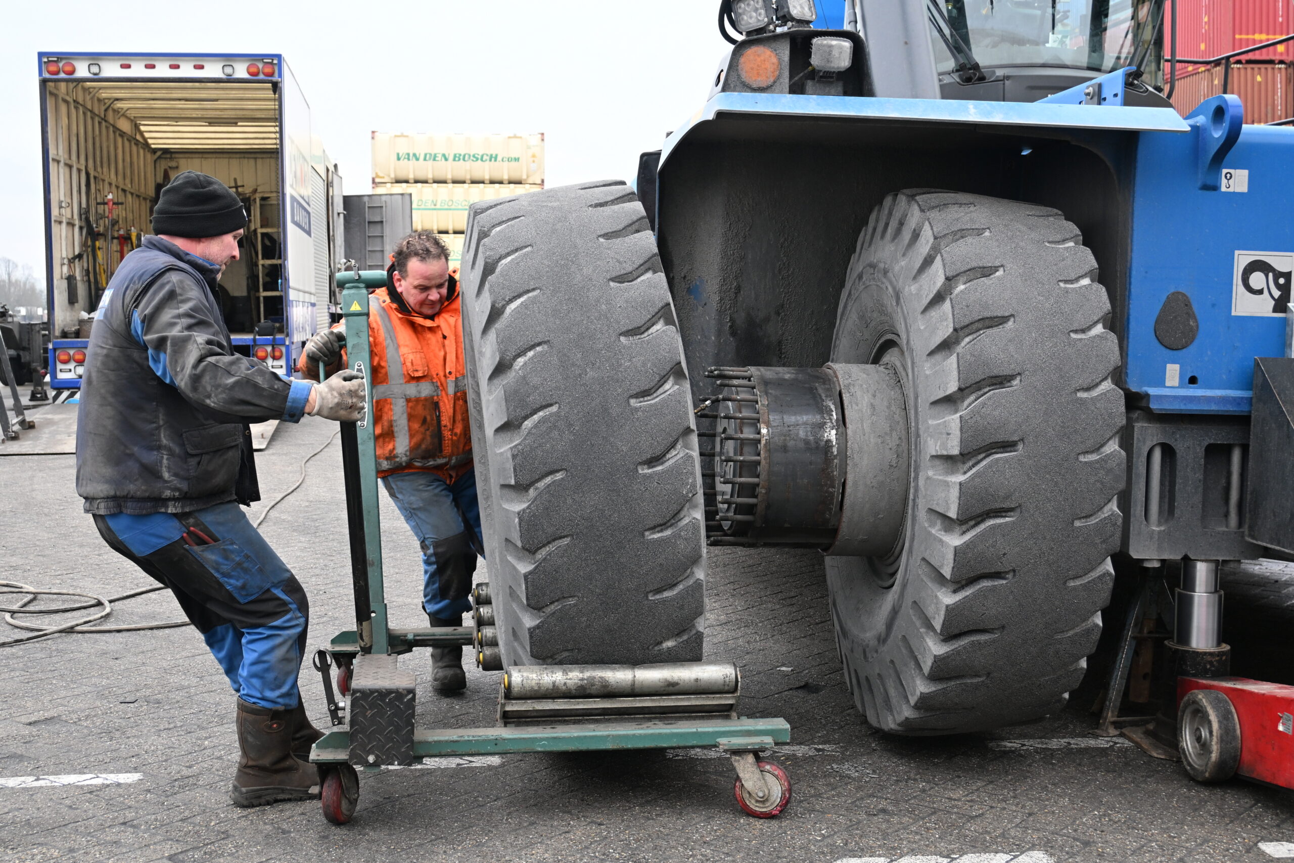 Op locatie hebben wij de banden van een zware terminalmachine vervangen. Dit soort machines draaien lange dagen en dragen continu zware lasten. Dat vraagt niet alleen om sterke, slijtvaste banden, maar ook om vakkundige montage en de juiste apparatuur.